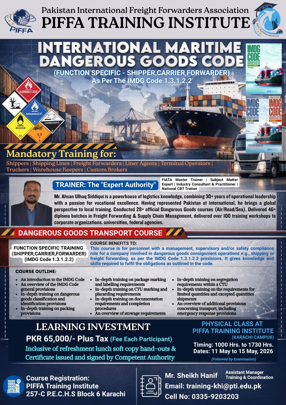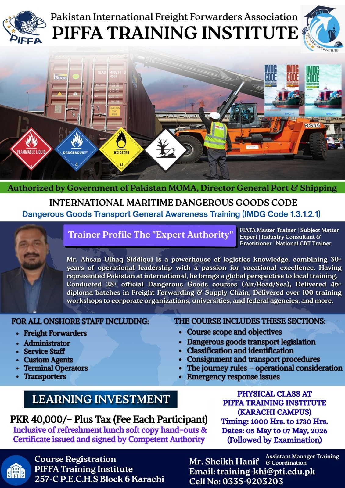 FACULTYHe has Masters Degree in Transport Management from Karachi University and has 25+ years of experience in Freight Forwarding Industry. He is in the Faculty of PIFFA Training Institute as well of CILT. He is a FIATA Trainer for Diploma Course in Freight Forwarding since 2007.